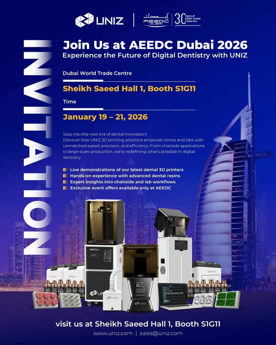 More than an annual global dental event, AEEDC Dubai 2026 serves as a key barometer for the future of digital dentistry. UNIZ cordially invites dental professionals from around the world to visit the UNIZ booth and experience firsthand how digital collaboration across clinical and laboratory settings can drive greater efficiency, precision, and intelligence in dental manufacturing.